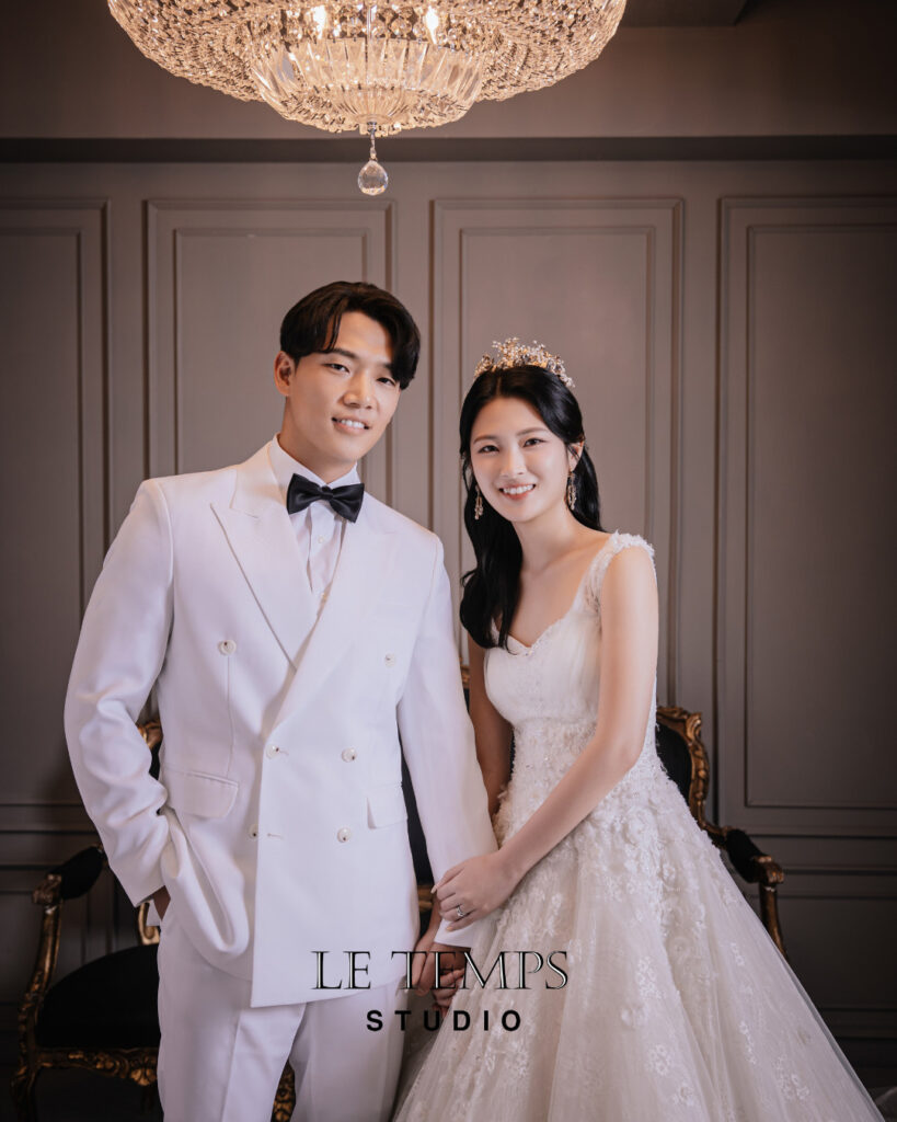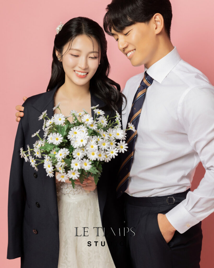 一方、新郎様はスラッとした体型で、スタイリッシュな雰囲気の方。撮影衣装を選ぶ際に、スタッフからホワイトスーツをご提案したところ、「確かに似合いそう」とすぐに気に入ってくださいました。韓国のフォトウェディングで人気のホワイトスーツは、クリーンで洗練された印象を与えるので、都会的な堀江スタジオの背景とも相性抜群です。撮影中もその着こなしは抜群で、まさに“画になる”おふたりでした。