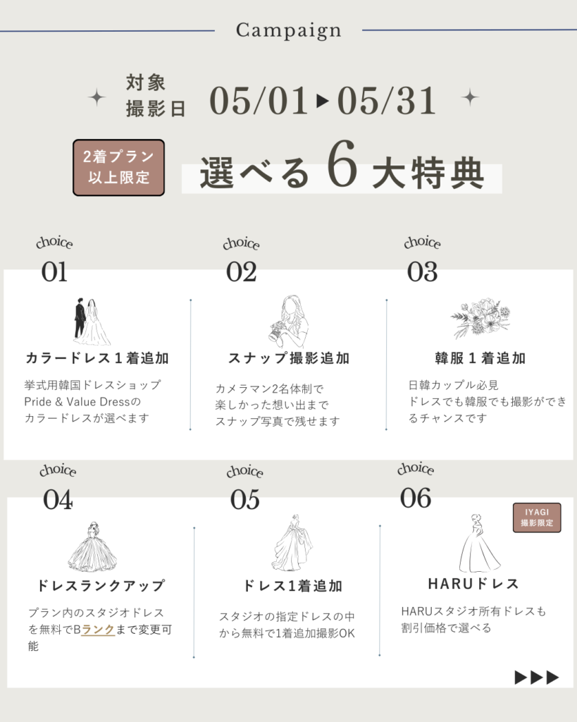3月中に新規でご予約いただいた方限定で、2026年3月〜2026年8月の撮影には、特典をプレゼント さらに!!5月撮影の特定日には、2着プラン以上の方限定で、下記の6つからお好きな特典をプレゼント