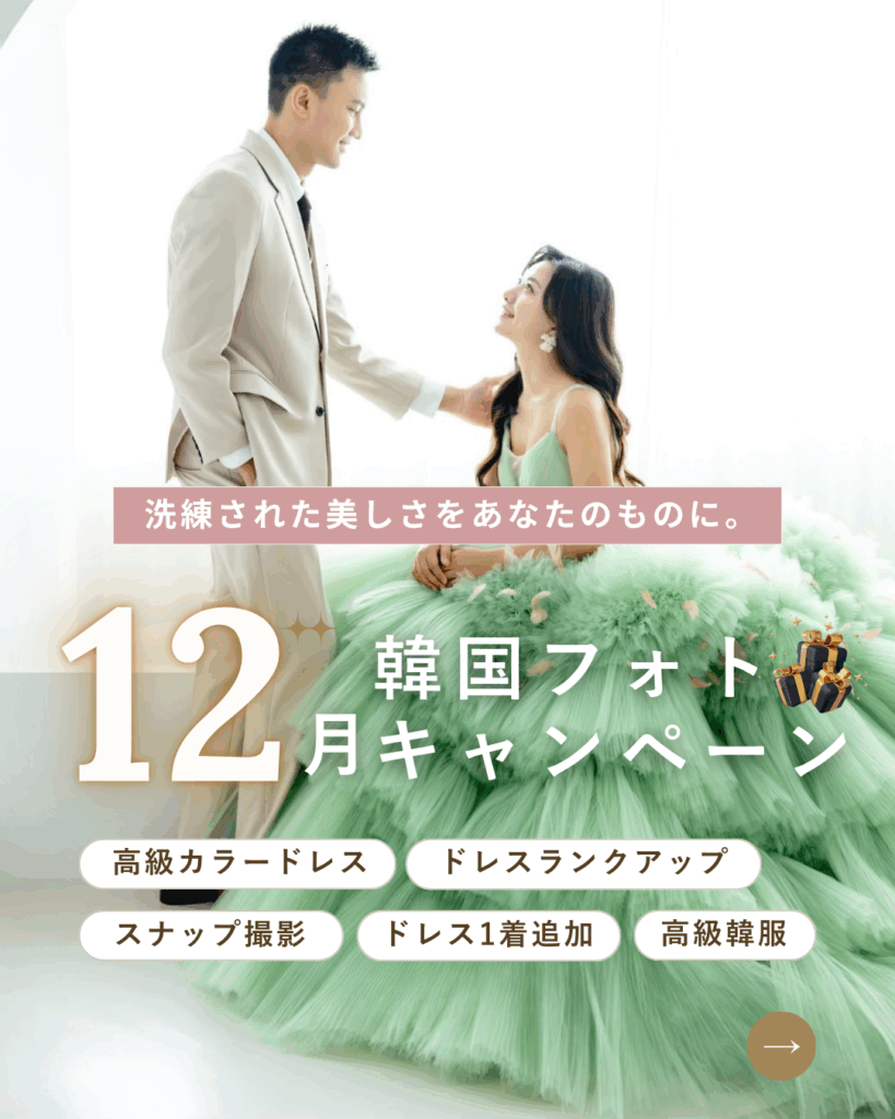 そんなプレ花嫁の皆さまを応援する、今だけの特別キャンペーンをご用意いたしました12月限定の特典を多数ご用意しておりますので、この機会に理想のウェディングフォトに向けて一歩踏み出してみませんか?^^ 来年の結婚準備を始める方、フォトウェディングを検討中の方にもぴったりの内容です◎