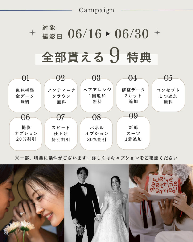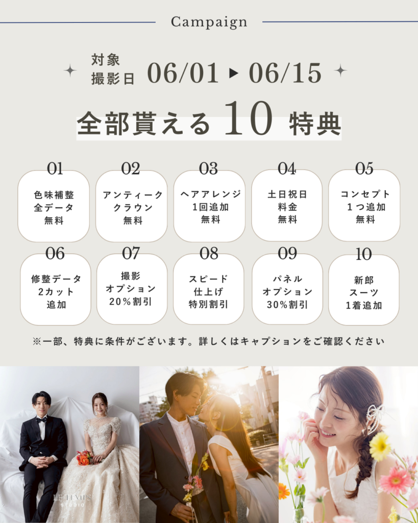そんなプレ花嫁の皆さまを応援する、今だけの特別キャンペーンをご用意いたしました3月限定の特典を多数ご用意しておりますので、この機会に理想のウェディングフォトに向けて一歩踏み出してみませんか?^^ 今から結婚準備を始める方、フォトウェディングを検討中の方にもぴったりの内容です◎