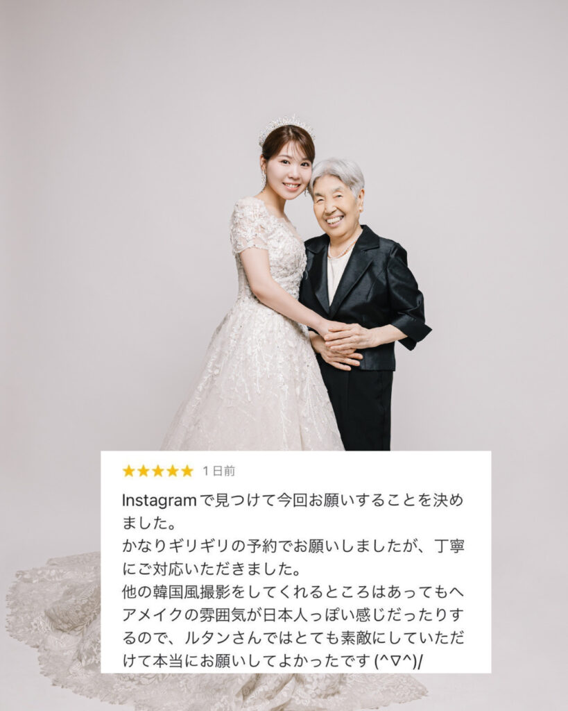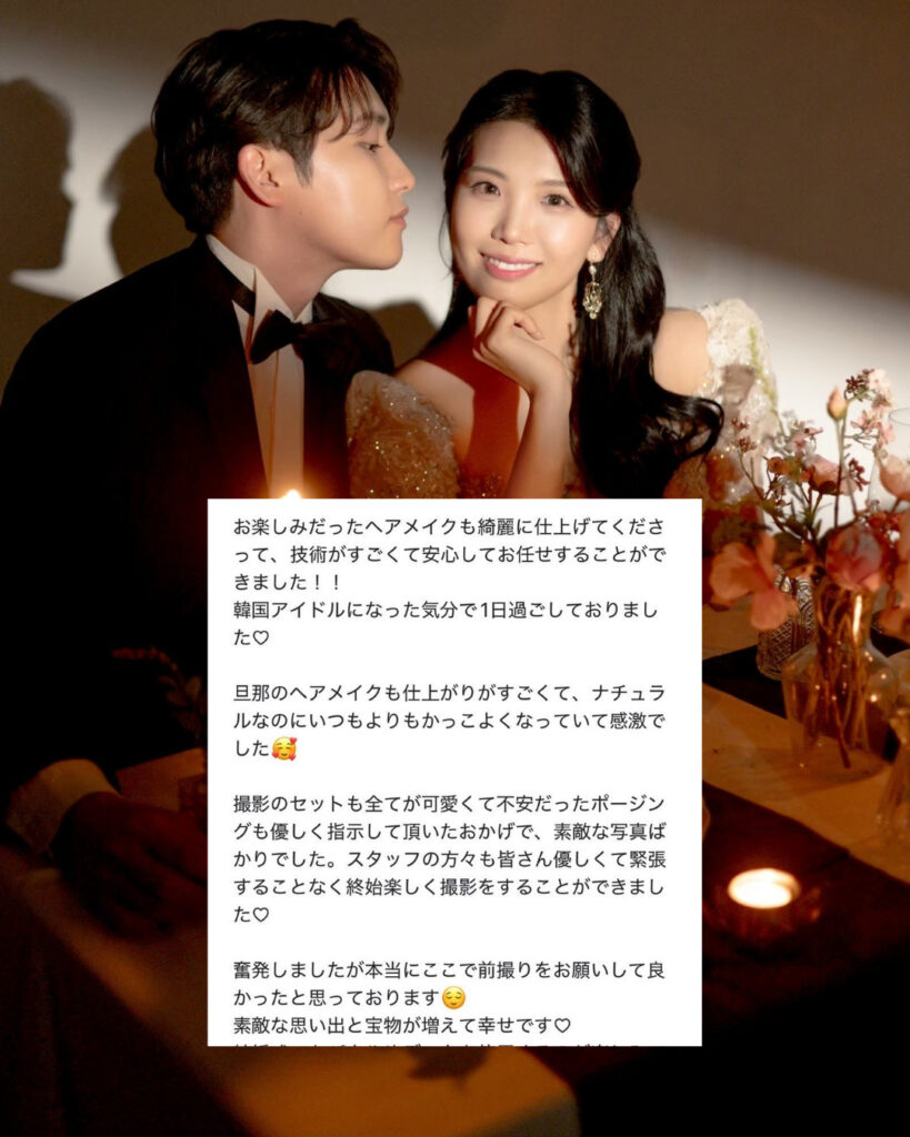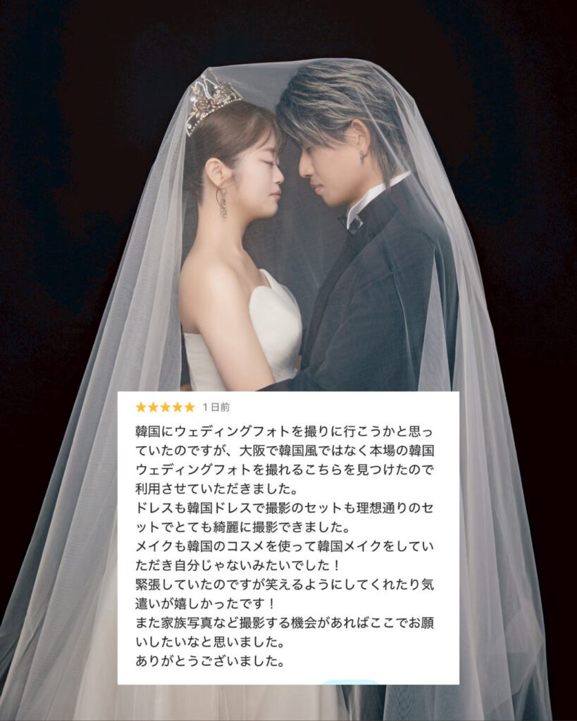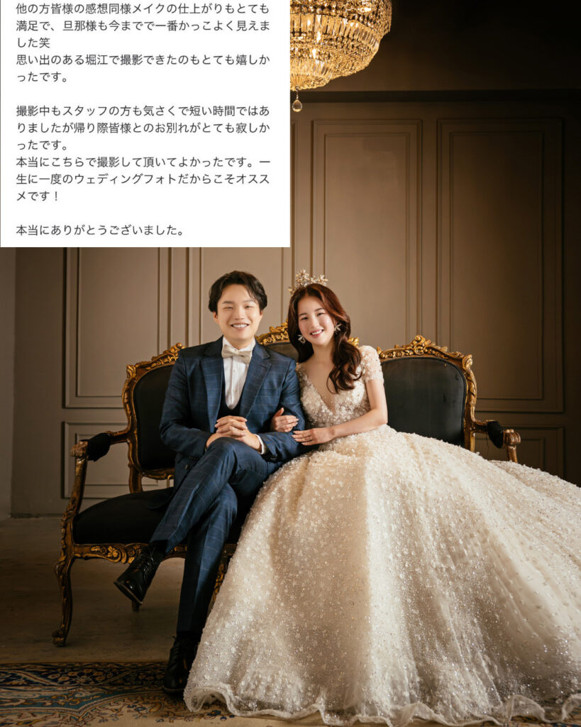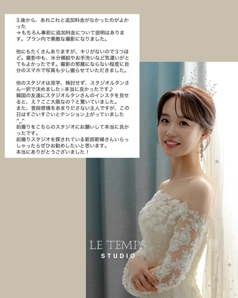 「プラン内容がしっかり説明されていて、衣装の種類も多く、安心してお任せできました」(20代・大阪府)