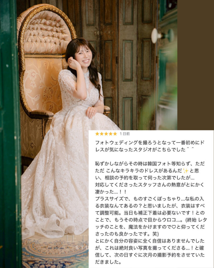 「ぽっちゃり体型でも調整してくださり、補正下着不要で快適でした。レタッチのことを“魔法をかけます”と言ってくれたのも印象的でした」(30代女性)